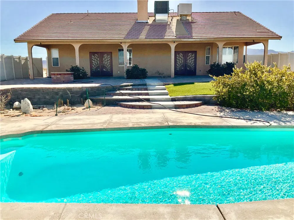 Welcome to your dream home, where luxury meets tranquility on an expansive 2.29-acre lot. This breathtaking 3-bedroom, 2-bath home offers 2040 sq. ft. of meticulously designed living space, perfect for those who appreciate indoor-outdoor living and refined comfort. Step inside to find gorgeous wood flooring throughout and a freshly painted interior that exudes elegance. The kitchen is a chef's dream complete with stainless steel appliances, while the open-concept layout flows effortlessly into the spacious living areas. Natural light floods the home through the beautiful wooden shutters, creating a warm and inviting atmosphere. The master suite is a true retreat, featuring an en-suite bath with a jetted tub, a walk in shower, and ample closet space with built in shelves. Venture outside to discover true resort style living. The stunning covered patio stretches the length of the backyard, providing a perfect space for entertaining or relaxing in the serene, landscaped yard. The lush turf adds beauty and ease of maintenance, while the luxurious pool invites you to cool off and unwind. This homes sparkling pool has just been refinished, giving it a sleek, like-new appearance that invites you to dive right in. The fresh, modern look complements the outdoor space beautifully, creating a perfect spot for relaxation or entertaining. Come se this backyard oasis for yourself-you'll feel like you're on vacation ever day!! A fully paid solar system ensures energy efficiency year round! For the golf enthusiast, the front yard boasts a putting green with unobstructed desert views stretching for miles. Enjoy the peaceful front patio as you take in the magnificent desert sunsets. Additional highlights also include a private well and soft water system. Located close to the Military Base, Joshua Tree National Park and local shopping. Schedule a private tour today, to view this Spectacular home! A True Desert Gem!!